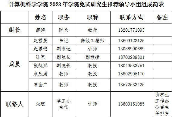 根据公司2023年推荐优秀应届本科毕业生免试攻读硕士学位研究生工作的通知要求,为保证公司推荐工作的顺利实施,经公司研究决定,成立计算机科学公司2023年免试研究生推荐领导小组,名单如下表所示: