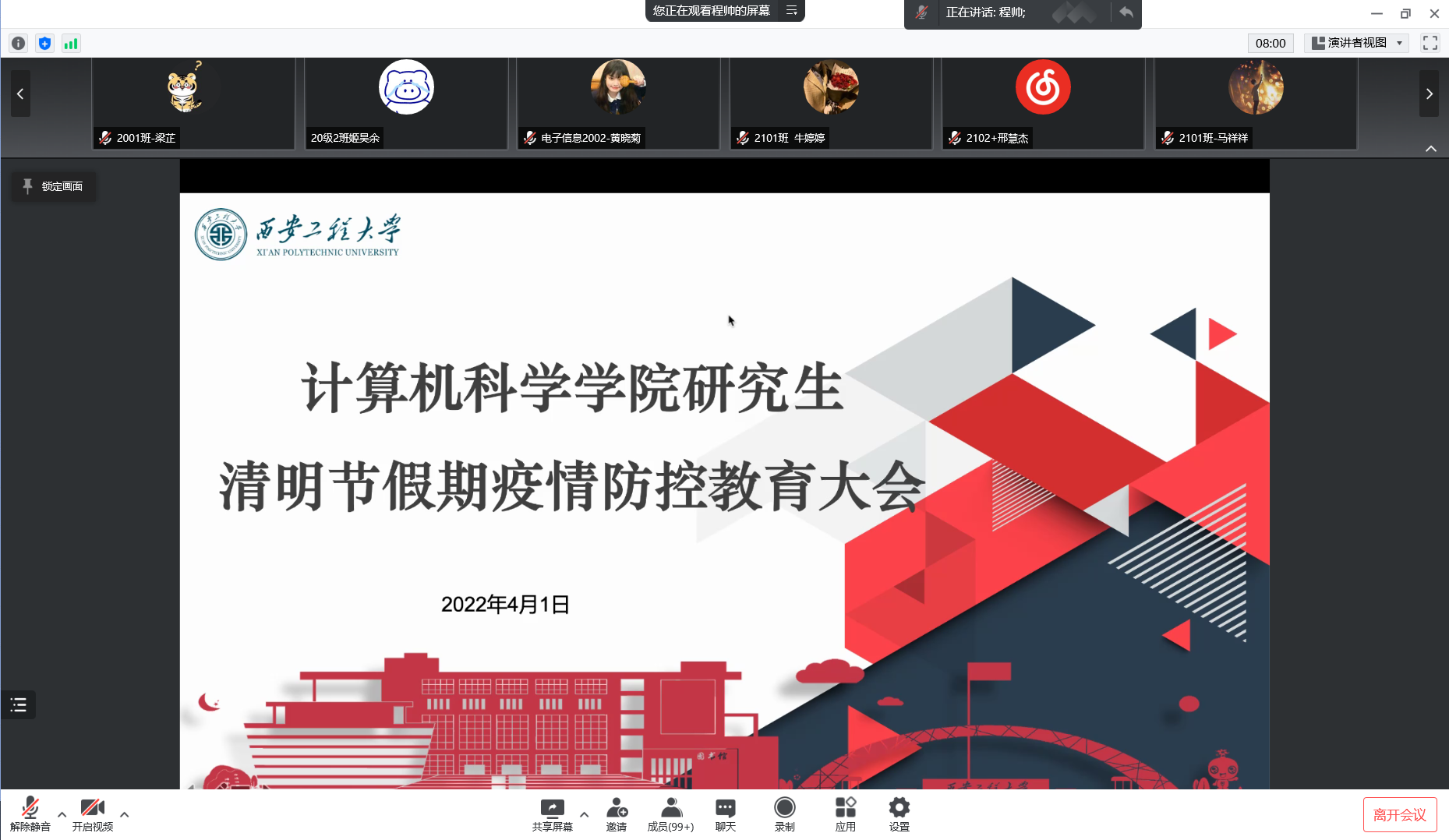为进一步让员工了解当前疫情防控的严峻形势,提高公司研究生的疫情防范意识,避免新冠疫情校园传播风险,4月1日18点,美加墨世界杯官方网站在线上召开研究生清明节假期疫情防控教育大会。会议由研究生辅导员程帅主持,全体研究生参加了此次会议。