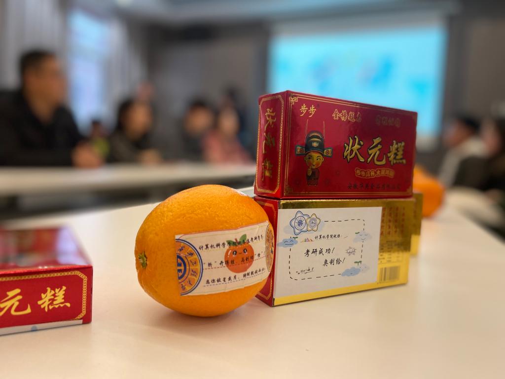 动员会的最后,公司领导共同为每一位考研员工送上了公司精心准备的加油包。里面包含了“时时好运 步步高升”状元糕、承载学弟学妹寄语的“考研必胜”加油卡以及寓意“脐”开得胜,马到功“橙”的脐橙,以此来助力考研学子,为他们打call,为他们加油,祝福他们取得优异成绩!(撰稿:张鑫 审核:王雅慧)