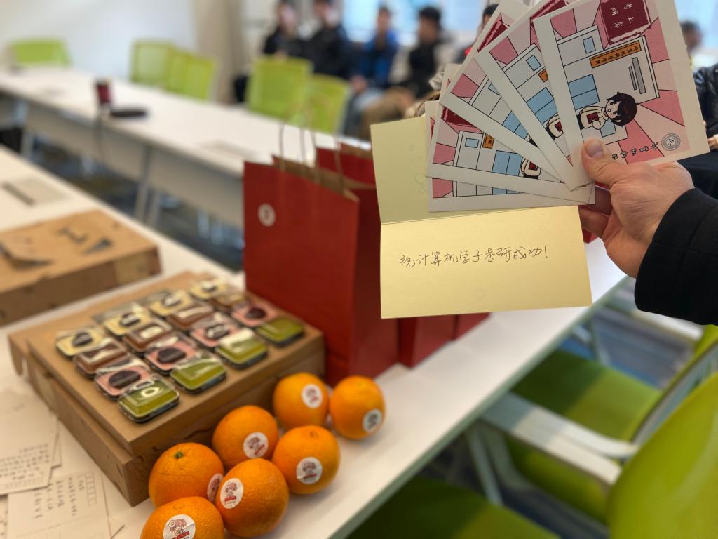 活动的最后,老师们共同为考研学子送上了公司精心准备的助力加油包。加油包包含了寓意“脐”开得胜,马到“橙”功的脐橙和金榜“糕”中的温馨蛋糕以及承载老师同学祝福的“考研上岸、逢考必过”明信片,以此来为考研学子加油打气。