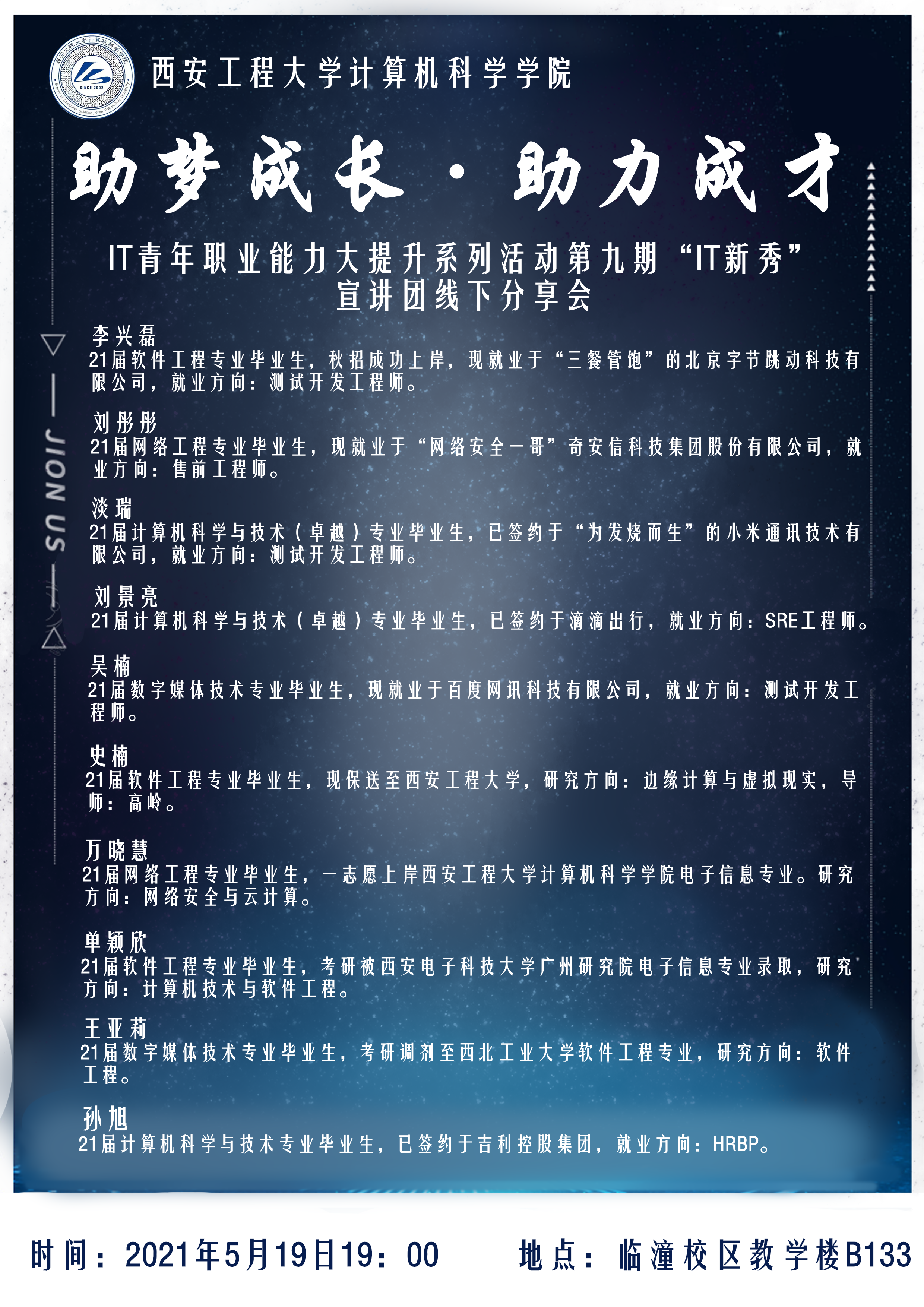 5月19日,公司在临潼校区B133教室举办了“IT新秀”宣讲团的首场线下经验分享会,邀请到2021届毕业生中的10名优秀代表进行分享,分享会持续近3个小时,气氛活泼而热烈,公司辅导员张鑫、左温慧及300余名主动报名员工参加。
