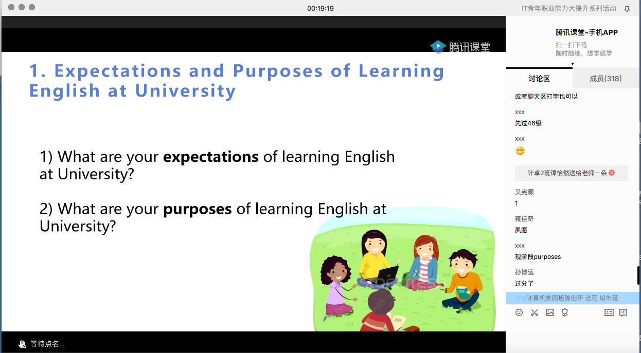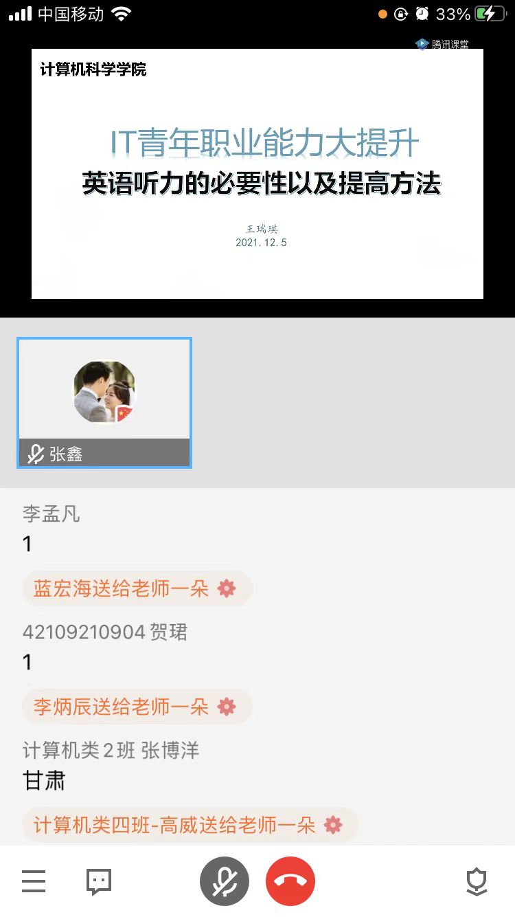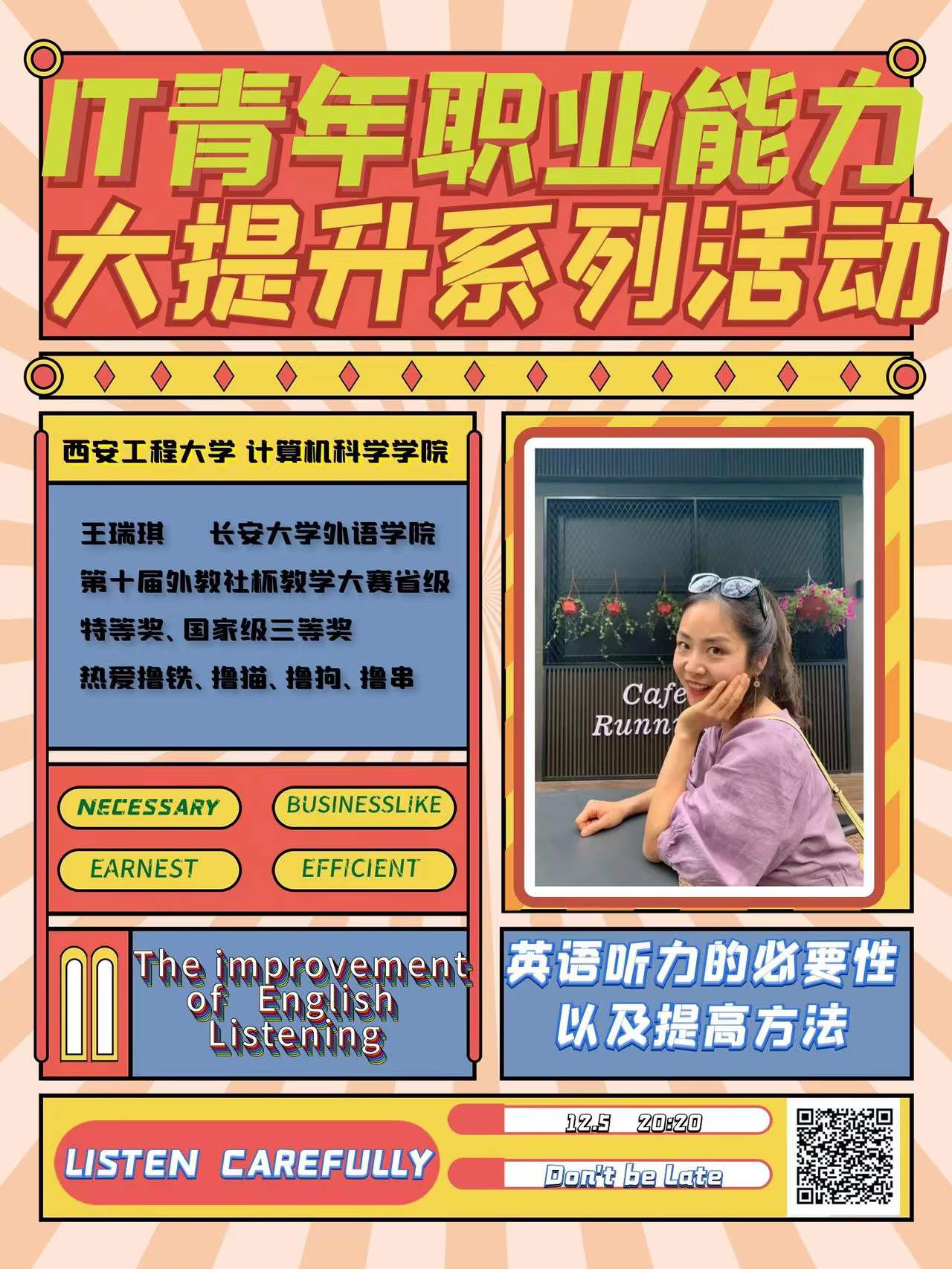 12月5日,计算机公司利用腾讯课堂平台,举行IT青年职业能力大提升系列活动之英语听力的必要性以及提高方法,长安大学外语公司王瑞琪作为本次活动的主讲人,2021级和2020级共400余名员工参加了本次线上讲座。