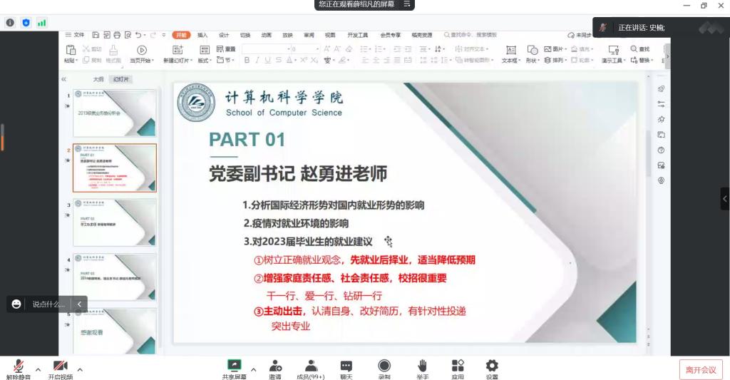 会议伊始,薛老师首先分析了近三年的就业考研情况,就业率持续下降的同时考研率大幅上升。近年来,各大互联网公司持续“人员优化”,企业不断提高门槛,本科生就业压力增加。而00后占据主导后,慢就业缓就业进一步加剧。面对当前的就业现状,我们公司制定了专门的2023届就业工作计划,助推大家顺利就业。