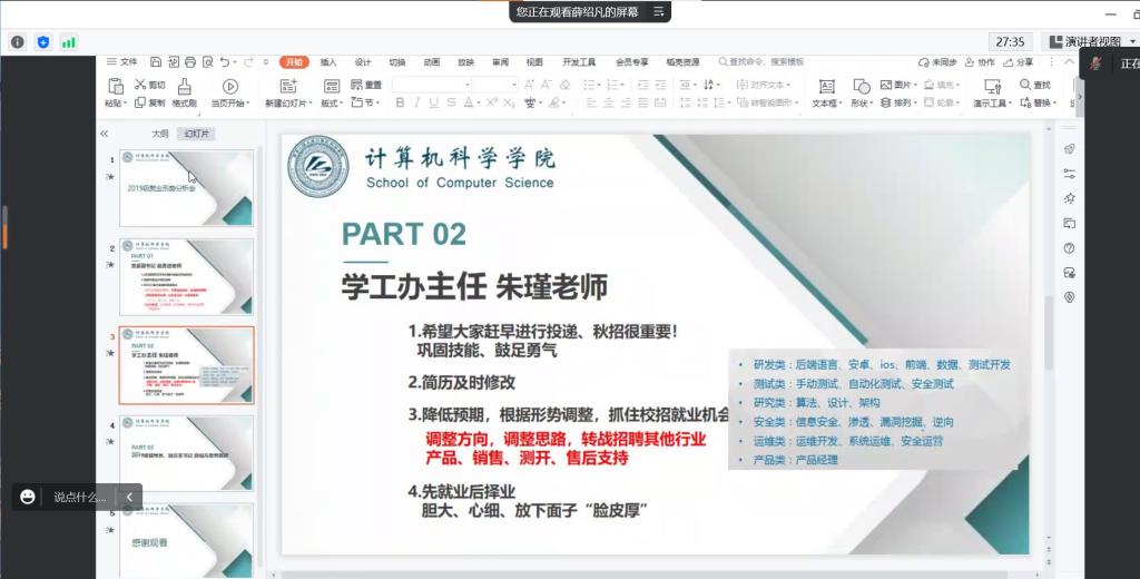 结合当前就业形势,学工办主任朱瑾也给大家分享了几点就业建议。首先,希望大家尽早投递,巩固技能,鼓足勇气,把握校招机会,争取顺利就业;第二,注意及时修改自己的简历,根据岗位进行灵活调整;第三,根据形势降低预期,调整就业方向和就业思路,可以转战销售、测开、售后支持等其他行业,做到先就业后择业;第四点,在找工作时,要胆大、心细、放下面子,做一个勇敢的人。