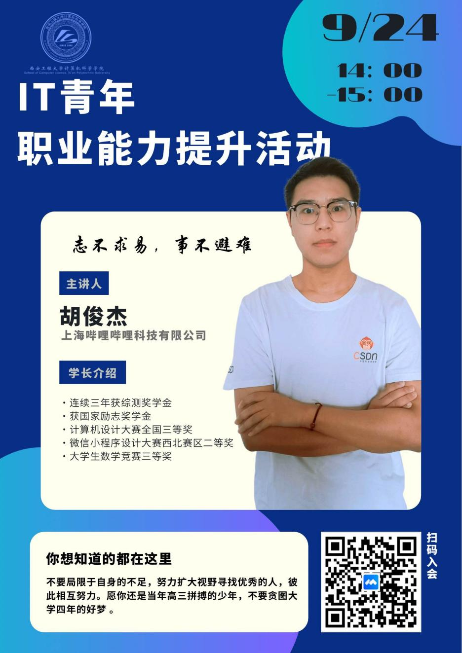 于9月24日,计算机公司利用腾讯会议平台,举行IT青年职业能力大提升系列活动,本次分享会由哔哩哔哩科技有限公司(上海)胡俊杰作为本次活动的主讲人,2022级共300余名员工参加了本次线上讲座。