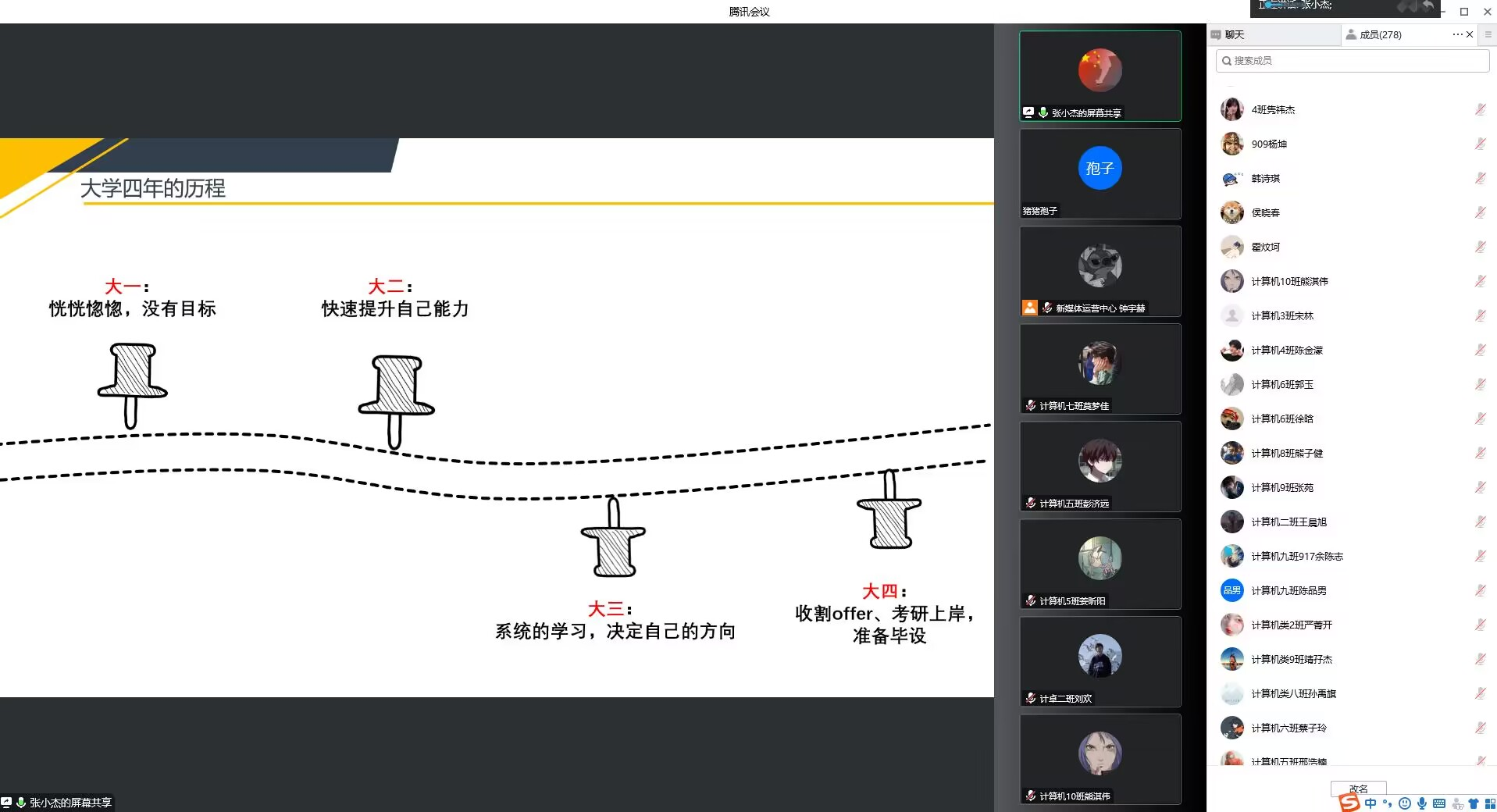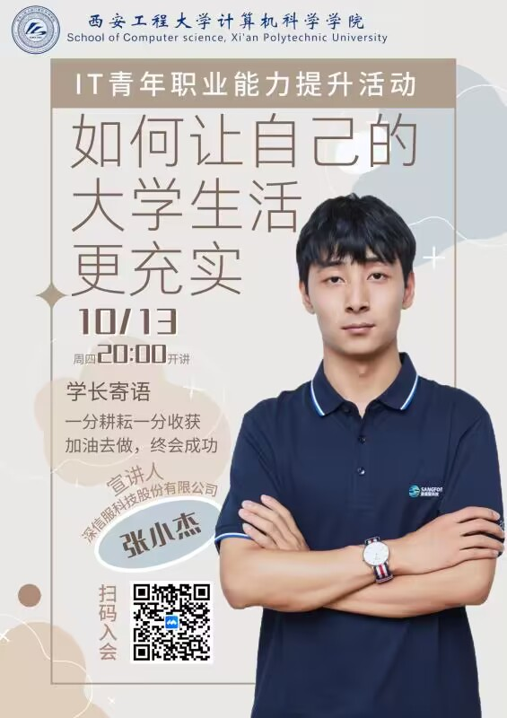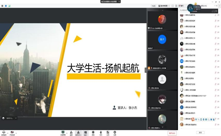10月13日,计算机公司利用腾讯课堂平台,举行IT青年职业能力大提升系列活动之如何让自己的老员工活更充实,历届学长张小杰作为本次活动的主讲人,现就任于深信科技股份有限公司,2021级和2020级共400余名员工参加了本次线上讲座。