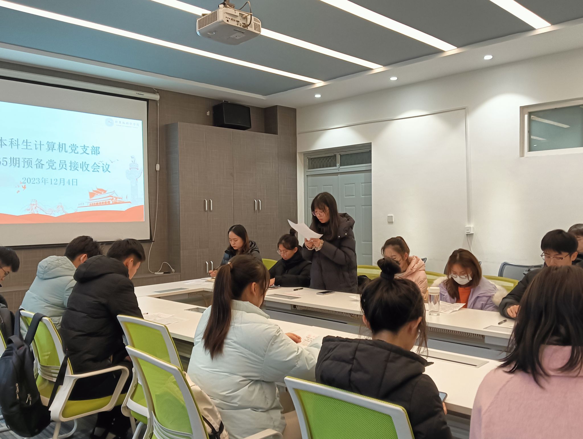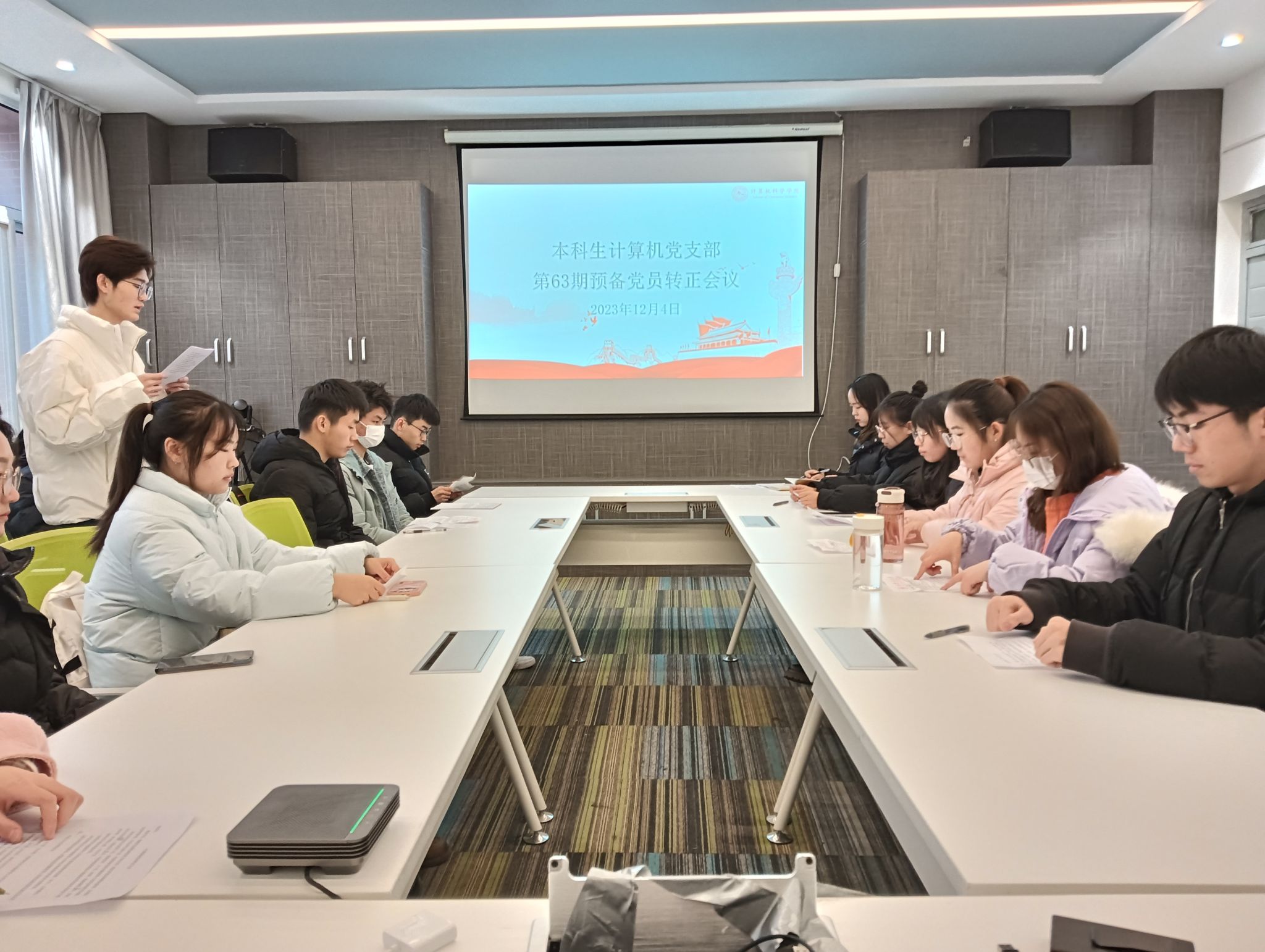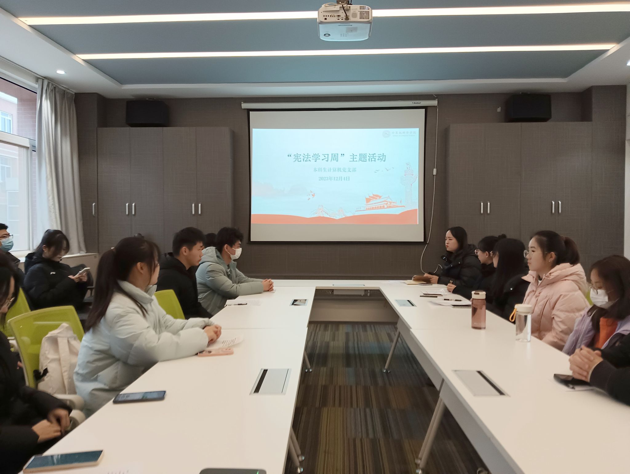 12月4日,本科生计算机党支部在公司楼426会议室召开党支部大会,讨论党员发展事宜,并开展了“宪法学习周”主题教育活动。党支部书记左温慧及全体党员参加。