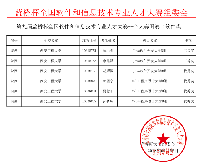 “第九届蓝桥杯全国软件和信息技术专业人才大赛”全国总决赛于5月26日在北京隆重举行,来自千余所高校的5000余名蓝桥杯省赛一等奖选手云集京城,角逐蓝桥杯最高荣誉。美加墨世界杯官方网站高晓娟老师、王爱丽老师带领着6位同学参加C/C++程序设计和JAVA软件开发全国大赛。最终,童小凯获得了JAVA软件开发二等奖,李昆洪获得JAVA软件开发三等奖,胡耀国获得JAVA软件开发优秀奖,韩熙宇、贾聪阳、孙梦琼分别获得C/C++程序设计优秀奖。