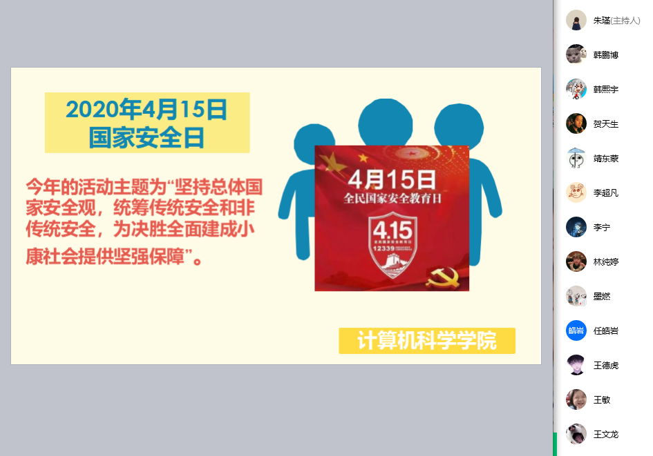 此外,公司还要求面向全体员工开展安全教育。各年级也纷纷以召开网络视频会议集中学习、居家收看安全防范视频、自学《中华人民共和国国家安全法》等形式,接受国家安全教育、提升抵御风险的能力。