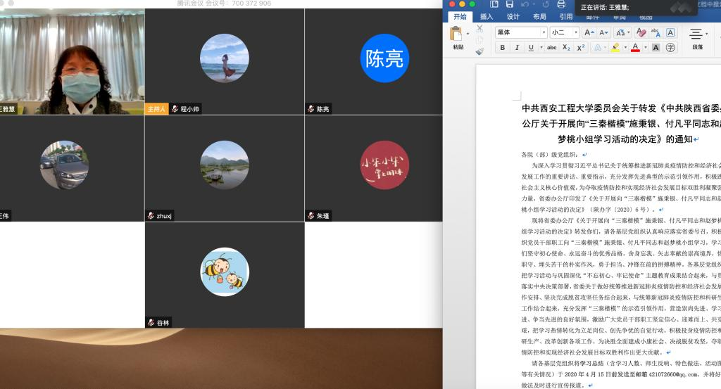 接着,与会成员结合自身对先进典型的学习畅谈体会与收获,纷纷进行交流发言。公司经理薛涛教授表示,“三秦楷模”的先进事迹动人心弦、感人肺腑,我们应以先进典型为榜样,挺身而出,迎难而上,共克时艰,在公司的公司产品、科学研究等工作中充分发挥先锋模范作用,统筹推进公司疫情防控期间的各项工作顺利开展,勇做教育的先行者,立足岗位做贡献。公司党委委员朱欣娟教授表示,在疫情出现后,有很多的医护人员和志愿者奋战在一线,他们的先进事迹确实感人,为我们树立了榜样。作为教师,我们应时刻以先进人物为榜样,坚决执行公司各项纪律要求,从指导好每一位员工做起,以更大的工作热情,更加顽强的工作作风,不断创新工作方法,突破工作瓶颈,将自己的业务水平推向更高的层次。公司党委委员、教工党支部书记王伟副教授表示,作为一名教育工作者,我们要学习先进典型舍身忘我、无私奉献的崇高精神,学习他们敢于担当、冲锋在前的担当精神,坚守教书育人岗位,弘扬爱国主义精神,认真上好每一堂课,为员工的健康和成长保驾护航,践行师者初心,助力抗疫胜利。其他与会成员也纷纷发言,畅谈自己学习体会。他们表示,一定服从公司的各类安排和纪律要求,向榜样学习,立足自身岗位,做好本职工作,完成疫情防控期间和开学准备各项任务。