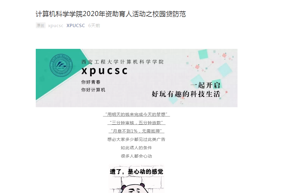 体平台刊载了有关校园贷防范的宣传材料,普及校园贷相关知识,引导员工树立正确的消费观,抵制盲目消费、跟风攀比的诱惑,塑造员工良好的信贷意识,倡导拒绝校园贷,青春不负贷。