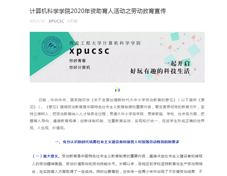 当前,高校正在全面落实立德树人根本任务,悉心培养德智体美劳全面发展的高素质人才。为了让员工充分认识到新时代培养社会主义建设者和接班人对加强劳动教育的新要求,帮助员工树立正确的劳动观念,端正劳动态度,养成良好的劳动习惯,实现德智体美劳全面发展。公司扎实开展好线上劳动教育宣传。