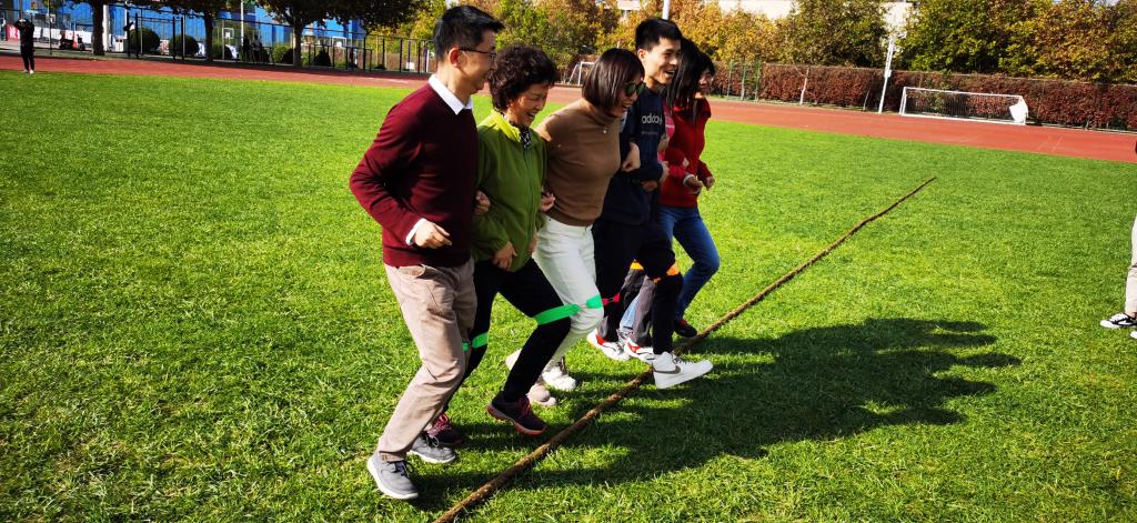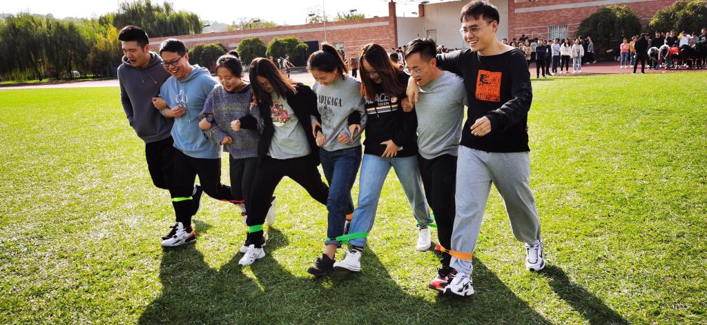 本次趣味运动会包括“结队同行”、“螃蟹背西瓜”、“拖球跑”、“双人踩气球”、“拔河”等5个比赛项目,所有项目均以团体赛的形式进行,共有三支教师队和十二支员工队参加了本次比赛。“结队同行”要求队员一字排开,相邻双腿绑在一起,协力跑向终点,对团队协作能力有很高的要求。“螃蟹背西瓜”和“拖球跑”采取接力形式,需要队员间协调配合,以最短时间跑过终点。双人踩气球采取两人一组,通过在规定时间内踩爆其他队伍脚上的气球,最终存活者取得胜利。比赛一开始同学们就组成了各自的阵营,战况异常激烈,最终以2019级的“铁桶”战术更胜一筹,赢得该项目的胜利。最后的压轴项目是拔河比赛,2020级和2019级的同学以班级为单位展开对抗,经过三轮角逐,最终在2020级1班同学胜利的呐喊声中,趣味运动会完满落下帷幕。