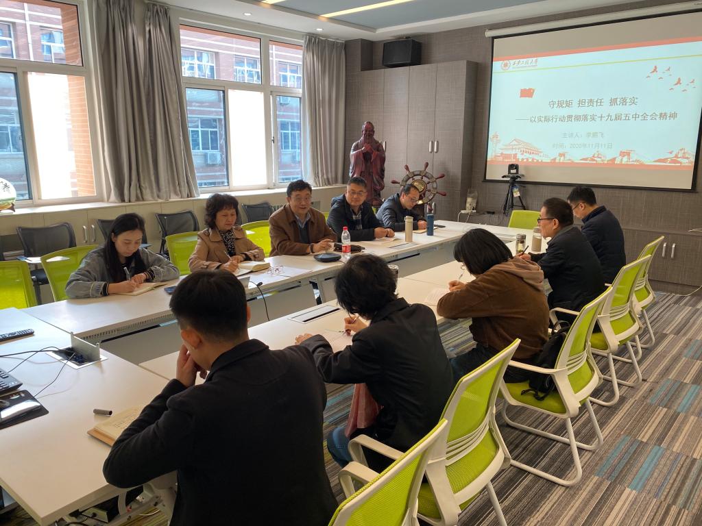 随后,李鹏飞副董事长结合自身学习,以《守规矩担责任抓落实——以实际行动贯彻落实党的十九届五中全会精神》为题讲了专题党课。他首先从两个100年奋斗目标、国家发展依靠科技创新驱动、国防和军队现代化建设等方面对党的十九届五中全会精神进行了深入浅出的解读。之后他结合电影《上甘岭》中的若干经典片段,生动阐述了党的建设的重要性,并要求公司领导班子成员要在如何结合公司实际,将全会精神贯穿到团队建设、人才培养、公司发展等各项工作中等方面多思考,切实做到守规矩、担责任、抓落实、出成果、保稳定。他还要求与会全体成员要带头认真学习贯彻党的十九届五中全会精神,进一步加强党的建设,旗帜鲜明讲政治,不断提高政治站位,全院上下统一思想,坚定信心,结合公司学科和专业优势,齐心协力,抢抓机遇多出成果,积极挖掘潜力,激发动力,狠抓工作落实。同时要强化对员工的安全教育和管理,消除安全隐患保稳定,为公司营造一个良好的干事创业氛围,不断开创计算机公司工作的新局面。