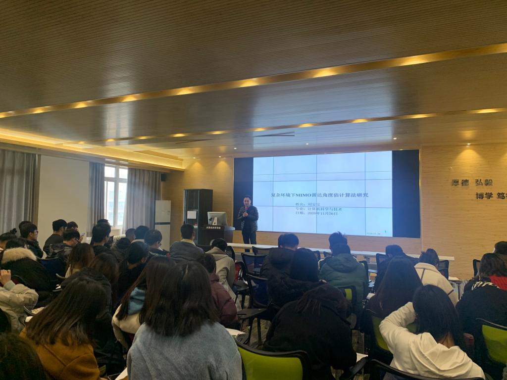随后,刘宝宝以《复杂环境下MIMO雷达角度估计算法研究》开展主题报告,着重介绍了复杂环境下双基地/单基地MIMO(Multiple-in Multiple-out)雷达角度解决的关键问题,并结合自己的科研经历就如何开展科研工作向同学们提出建议:一是在研究初期学会精读文献,高质量的文献资料对学术研究有着重大意义;二是积极主动的与导师交流,导师会在科研工作中提供很多帮助;三是多动手写作,论文是研究生学习中关键一环,经常动手写作才能培养良好的写作习惯。此外,他还勉励同学们努力发表成果,积极申请留学访学的机会。