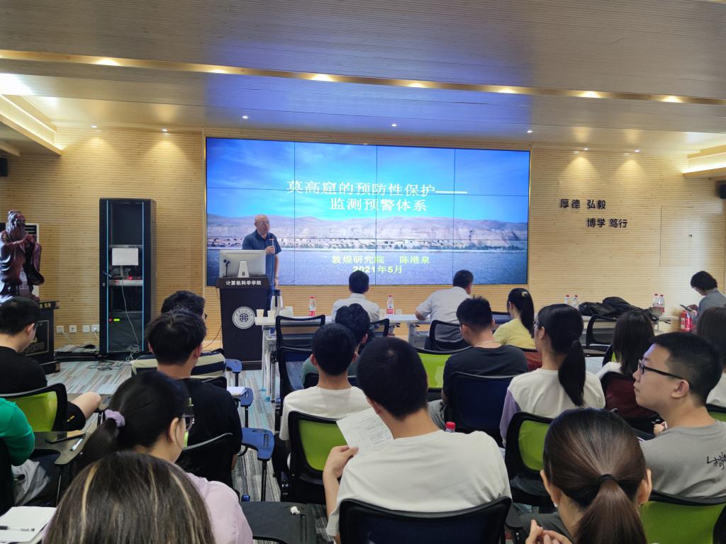 陈港泉处长首先介绍了莫高窟的价值,以此引入对敦煌莫高窟监测预警体系内容的阐述,围绕莫高窟壁画的制作工艺与壁画病害、当前壁画保存与莫高窟开放面临的问题、监测预警体系分析研究以及应用等方面,为在场师生分享了敦煌莫高窟的历史文化、莫高窟特殊的环境及病害、以及如何利用现有的监测预警技术对莫高窟进行保护预警等方面的知识和经验。