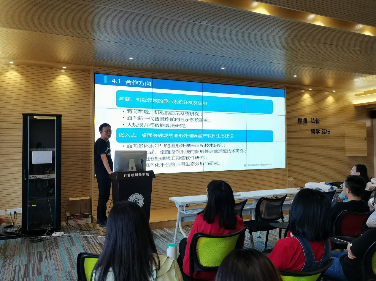 接着,刘晖着重围绕航空集成电路生态构建科研合作及人才培养给同学们进行了专题培训,具体包括了GPU应用概述、自主系列GPU研发体系、自主GPU生态链的构建、研究生联合培养的研发方向规划等四个方面。随后,他回答了同学们感兴趣的各类问题,包括国内GPU目前发展的技术阶段、发表相关学术论文的规划及要求、公司相关的福利待遇等。他表示,公司的技术研发团队将会竭力对研究生进行联合培养,并培养出具有专业技术能力和项目研发实践经验的研究生,力争成为校企联合培养研究生的样板。