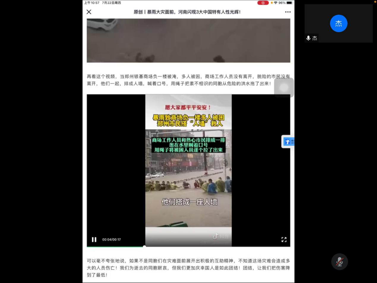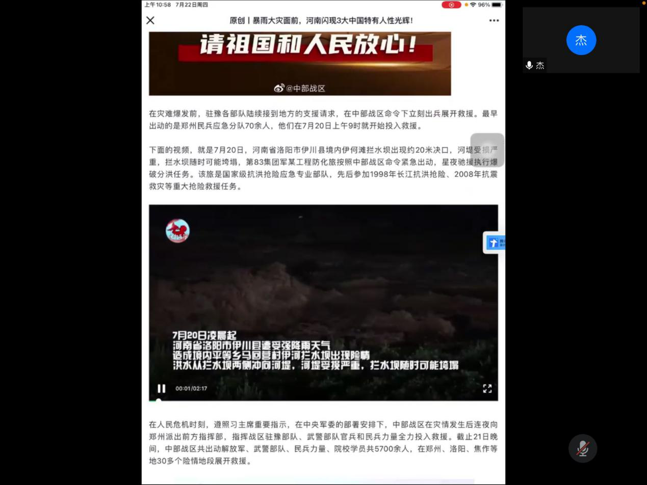 会上,吴艳杰首先带领全体党员学习了习近平总书记在庆祝中国共产党成立100周年大会上的讲话全文,重点学习了九个必须和习近平总书记对青年寄予的希望。接着共同观看了7月20日以来河南遭受暴雨抗洪救灾的相关文字视频资料,她说:我们党取得的伟大辉煌的成就,是无数先辈和中华儿女们不怕牺牲,英勇斗争,无私奉献创造得来的,今天我们是幸福的一代,生活在和平年代,但仍有祖国和人民面临灾难的时候需要我们挺身而出。尤其是一名党员,在祖国和人民需要我们时,更应该勇于担当,敢于面对挑战和困难。每个人都在努力,每个人都在向前,暴雨中他们用生命去守护美好的明天,所以我们更应该坚定信念,更应该努力学习好科技知识,为下一个一百年奋斗目标添砖加瓦。