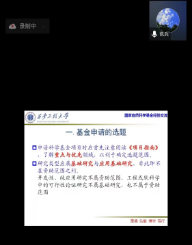 随后,张凯兵教授进行国家自然科学基金申报辅导报告。张凯兵教授结合自身多年来的学术研究和基金评审经验,对于申报书的撰写,他主要从两个方面进行了经验交流:一、基金申请的选题,首先注意阅读《项目指南》中的重点与优先支持领域,研究类型应属基础研究和应用基础研究,项目申报应选择自己有研究基础的,更能发挥本人学术优势的项目,在熟悉的领域中做擅长的事情。二、申请书撰写的注意事项,张凯兵以本人基金项目申报书为例,分别从项目题目、摘要、立题依据、关键问题以及特色与创新之处、年度研究计划及预期研究结果、研究基础与工作条件等多方面详细地阐述了项目申报书撰写时应该注意的事项。