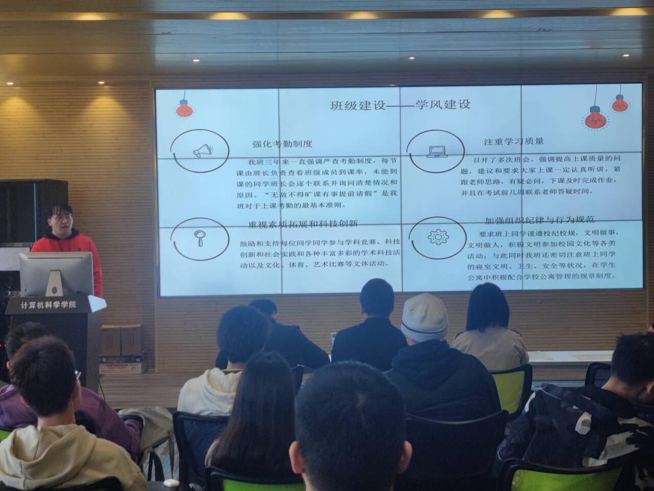 根据《关于开展2021-2022学年“优良学风示范班”创建活动的通知》的相关要求,经班级申报、公司初评、公司推荐、公司评审,本着公平、公开、公正的原则,经初步评选,全院共计19个班级参加了本次“优良学风示范班”答辩展示活动。参评班级主要通过PPT汇报的形式分别就本学年的班级制度、学习科研、党团活动、思想建设、文体活动、荣誉成绩等方面展示了各自优良的精神风貌,呈现了同公司不同的特色和亮点,赢得了参会老师的高度赞扬。随后,评委老师对参评队伍就班级管理、学风提升、团队凝聚等方面进行了提问,并给出了改进建议。