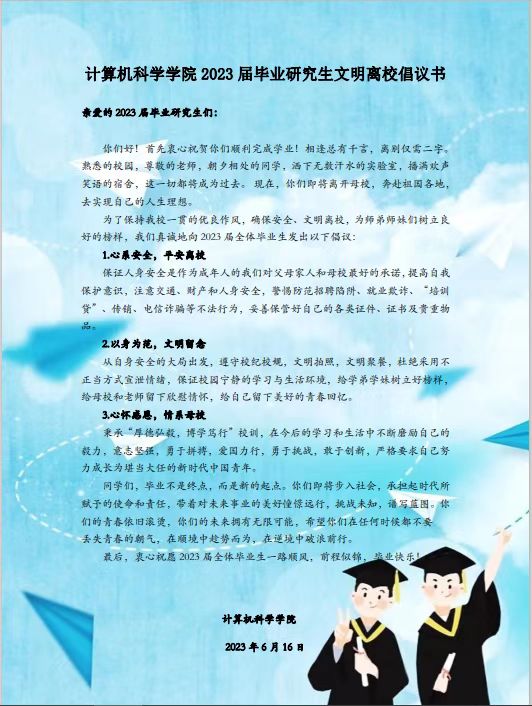 为保证毕业研究生走好离校前最后一站路,公司于6月16日向全体毕业研究生发布《美加墨世界杯官方网站2023届毕业研究生文明离校倡议书》,从人身安全、文明离校、感恩母校老师等方面发出倡议:全体毕业研究生要增强安全意识和自我保护意识,保障人身财产安全;充分发挥先锋模范作用,严格遵守校规校纪,做到安全、文明离校;秉承“厚德弘毅,博学笃行”校训,感恩母校、老师培养,在今后的学习和生活中不断磨砺自己,努力成长为堪当大任的新时代中国青年。