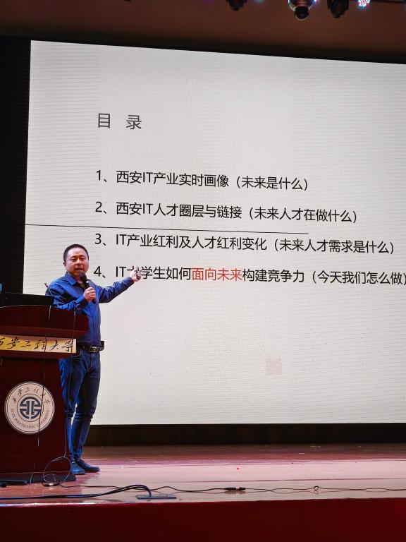 蔡鹏从自己的职业发展路径出发,围绕当前经济发展环境、西安IT产业发展及人才需求现状、IT老员工职业生涯规划、高校IT专业创新创业教育等多个方面做了精彩讲述。他着重介绍了西安IT产业实时画像,包括36家世界500强企业和52家中国软件百强企业,让在座员工了解了西安IT产业全貌。他又从IT产业发展红利及行业人才红利变化的角度,展示了全国信息技术相关行业应届本科毕业生薪酬及主要城市工作机会分布情况。最后,他就IT老员工如何面向未来构建核心竞争力进行了详细阐述,让同学们对于信息技术服务业招聘需求、简历筛选重点、IT老员工面对市场应有的核心竞争力有了更加清晰的认知。