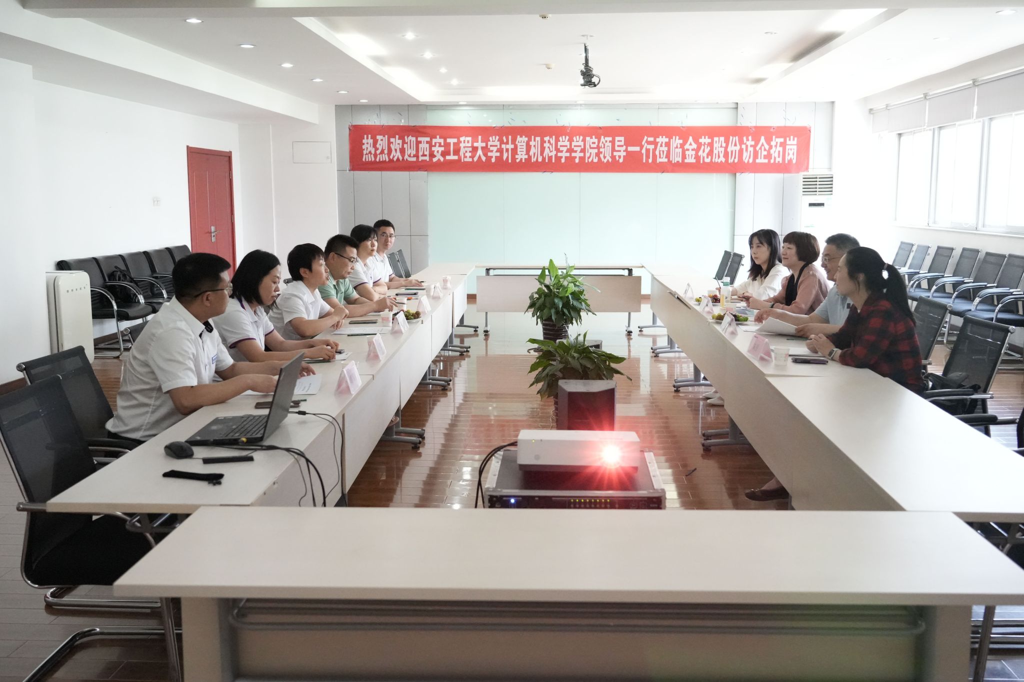 下午2点30分,赵雪曼、薛涛一行来到西安金花企业(集团)股份有限公司,受到公司副总经理陈雪妍等企业领导的热烈欢迎。在观看企业宣传片后,双方亲切座谈。薛涛详细介绍了公司规模、专业设置、团队队伍、人才培养等情况,赵雪曼介绍了公司2024届毕业生相关信息及目前就业情况,希望能与企业深化交流合作,在促进公司毕业生就业和企业发展方面实现双赢。座谈会上,校企双方就多个板块的合作可行性进行充分探讨并达成初步意向。