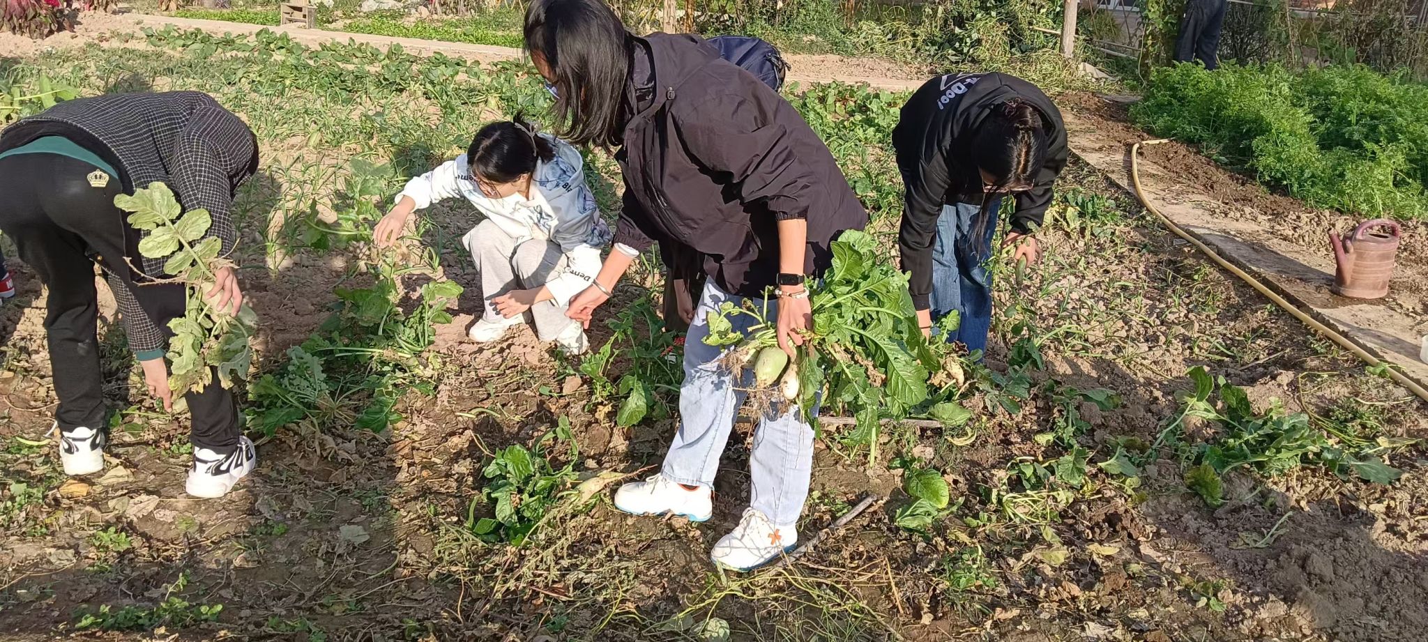 在随后的劳动实践中,老师带领同学们一起拔萝卜、除草、清理垃圾、翻整土地、播撒化肥和蔬菜种子。耕种小园的师傅在现场教大家怎样犁地、翻地、施肥、播种、浇水,怎样辨识不同的蔬菜,怎样使用各种农具。很多与劳动久违的同学在劳动过程中真切体会到了劳动的辛苦和播种的喜悦。“谁知盘中餐,粒粒皆辛苦”。各民族员工在共同劳动中更加体会到了在中华民族大家庭中各民族兄弟姐妹平等相待,团结互助,一起劳动为创造幸福生活而共同努力的深刻意义。虽然汗水浸湿了衣衫,但是大家在劳动中享受着快乐,都期待今天的播种明天就能发芽、生长,长出青翠甘甜的蔬菜。