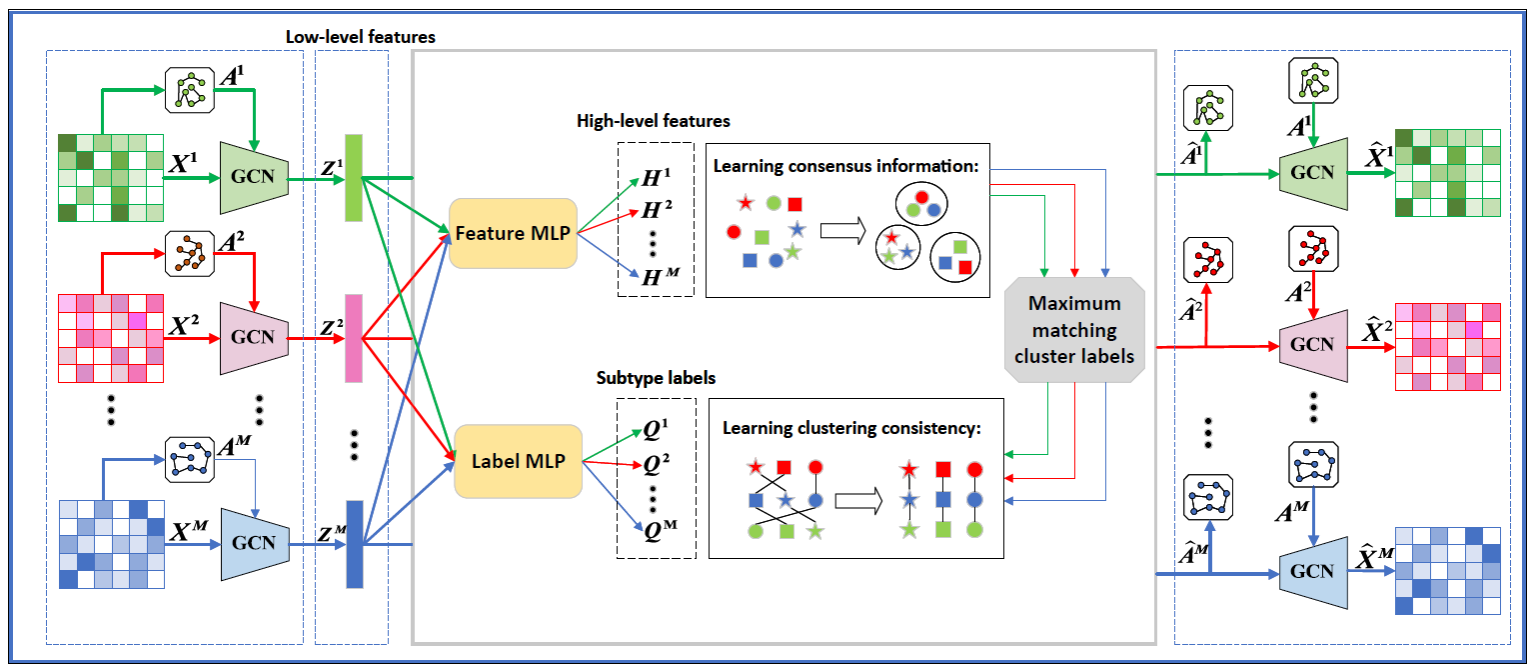 该研究为解决癌症异质性问题,提出一种新型的多视图多层次对比图卷积网络模型,通过有效整合多组学数据(如mRNA表达、DNA甲基化和miRNA表达)进行癌症亚型预测。传统方法往往忽略不同组学数据间的复杂关联关系,而该网络模型可从不同组学数据中同时学习多个层次的特征,并使用对比学习策略增强聚类效果。通过在34个公开数据集上的实验表明,该模型可显著提升癌症亚型预测的准确性,为揭示癌症生物学的内在机制与设计个性化治疗方案提供新的依据与思路。