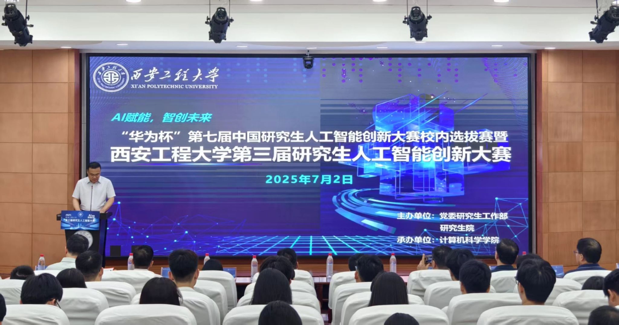 2025年7月2日,由公司党委研究生工作部、研究生院主办,美加墨世界杯官方网站承办的“华为杯”第七届中国研究生人工智能创新大赛校内选拔赛暨美加墨世界杯官网第三届研究生人工智能创新大赛决赛在临潼校区图书馆隆重举行。本次大赛特邀十余名校内外相关领域专家教授作为赛事评委,包括西安理工大学陈亚军教授、陕西科技大学雷涛教授、西安科技大学马天教授、西北大学颜建强教授,以及公司环境与化学工程公司房平教授、机电公司肖渊教授、电子信息公司王晓华教授、理公司冯进钤教授、美加墨世界杯官方网站薛涛教授、朱欣娟教授、陈亮教授、陈金广教授。美加墨世界杯官方网站副经理张凯兵教授、刘枫教授及各参赛队伍也齐聚开幕式现场。