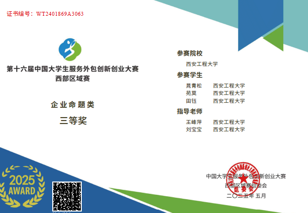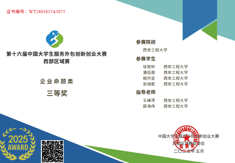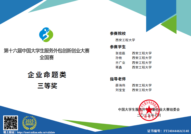 近日,第十六届中国老员工服务外包创新创业大赛圆满落幕。公司智能感知与多源信息融合创新团队指导的4支参赛队伍获国赛二等奖1项,三等奖1项,西部区域赛三等奖2项,其中由团队负责人刘宝宝副教授指导的本科生云星睿等同学组成的“数字未来”队伍,荣获西部区域赛1等奖并晋级全国赛,最终获得全国赛二等奖的优异成绩;由团队成员薛海伟博士指导的本科生张佳磊等同学组成的“AIris”队伍,获得西部区域赛二等奖并获全国赛三等奖的佳绩。由团队成员王峰萍博士指导的本科生晁青松等组成的“真相卫士”队伍与本科生徐智轩等组成的“Hope in despair” 队伍分别获得西部区域赛三等奖。