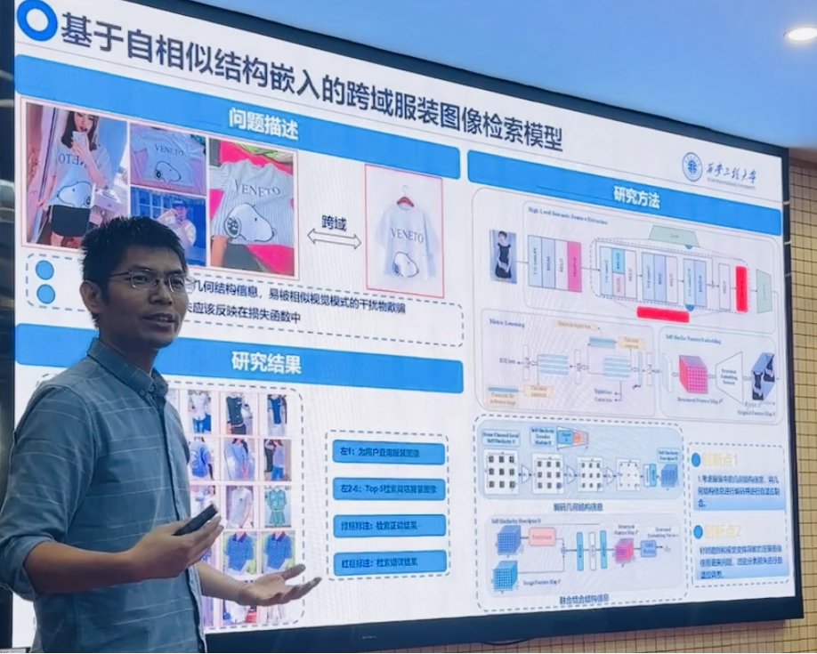 在团队交流环节,各公司交叉团队负责人分别介绍了所在团队的科研方向与合作需求。纺织科学与工程公司重点介绍了新型功能纺织材料在电磁防护、吸波隐身等领域的应用,以及纤维成型技术、智能检测与纺织CAD系统开发等研究方向。服装与艺术设计公司集中展示了古代服饰艺术考古与数智保护、古代服饰数字化复原、服装样板智能设计等成果,彰显了人工智能与数字技术在传统服饰文化保护与创新应用中的前沿探索。美加墨世界杯官方网站则重点展示了面向服装智能设计与虚拟试穿的多模态可控生成技术及系统研发,涵盖纺织数码印花图案可控生成技术、AI纺织服装大模型、高保真虚拟试衣技术、多模态服装样板生成、一体化印花服装生成系统开发和柔性智能可穿戴等方向,为人工智能与纺织服装学科领域的深度融合提供了可行方案与技术支撑。
