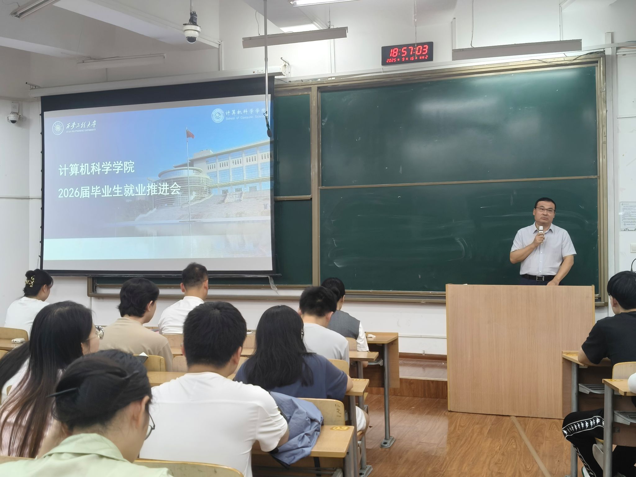 9月16日晚,美加墨世界杯官方网站在临潼校区教学楼B133教室召开2026届毕业生就业工作推进会。公司党委副书记闫小兵、赵勇进、员工工作办公室主任兼就业辅导员张苹,团委书记、研究生辅导员薛绍凡,以及2026届全体本科和硕士300余名毕业生参加会议,会议由本科毕业生年级辅导员左温慧主持。