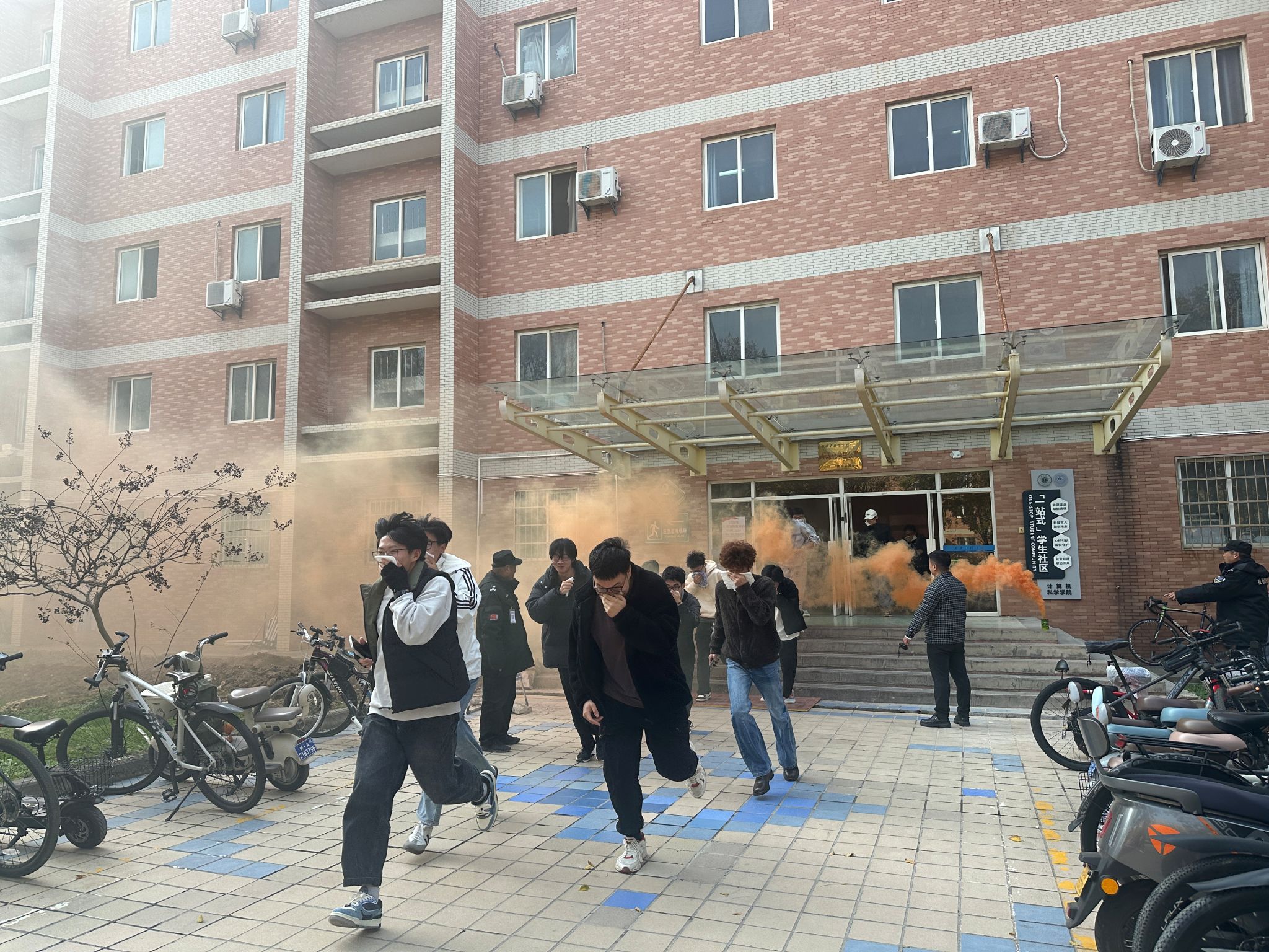 随后,应急疏散演练正式开始。刺耳的警报声响起,模拟烟雾迅速弥漫公寓楼道。在各楼层辅导员、公寓管理员及员工志愿者的有效引导下,大家迅速运用所学知识,用湿毛巾等物品捂住口鼻,做好个人防护,严格按照“弯腰低姿、沿墙前行”的要求,按照既定疏散路线,快速、有序地向楼外安全地带撤离。整个疏散过程衔接紧密、忙而不乱,数百名参演员工在规定时间内全部安全转移至指定集结区域。
