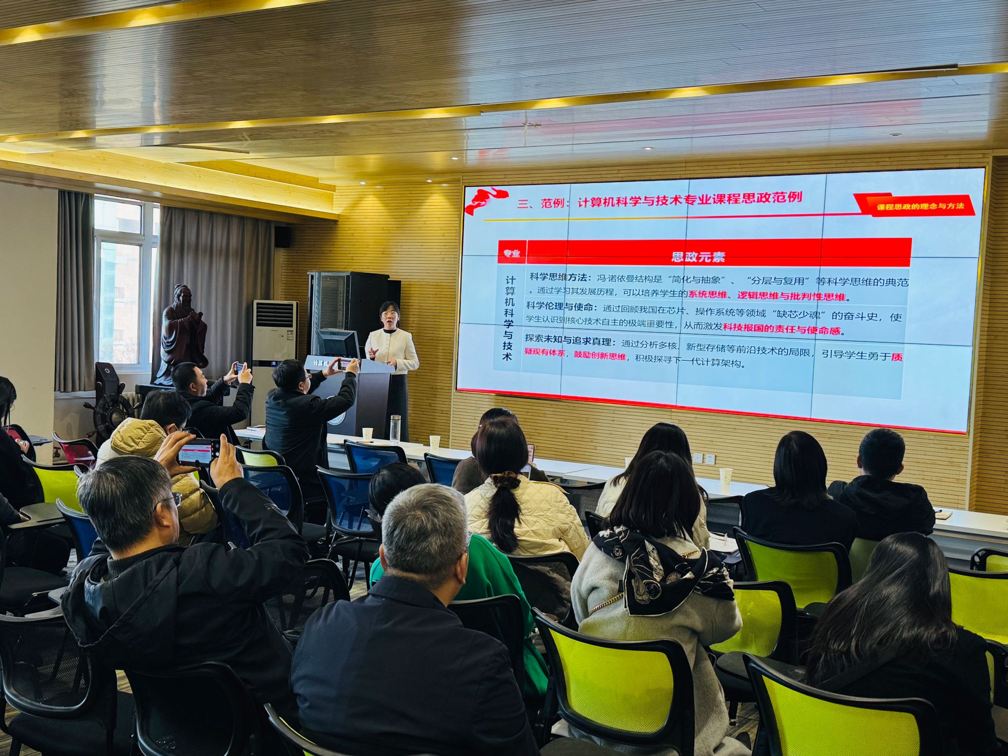 马克思主义公司牛佳欣老师围绕“真理与价值如何统一?课程思政告诉你”这一主题作专题分享。她紧密结合公司各专业教学特点,凭借详实的案例,对公司的四个专业进行了深入分析,探讨如何把“科学思维与探索未知、科技伦理与使命担当、科技报国的国家情怀”等思政元素,自然地融入知识讲授与能力培养的全过程,为教师提供了一套提升课程育人高度和教学感染力的实践方案。