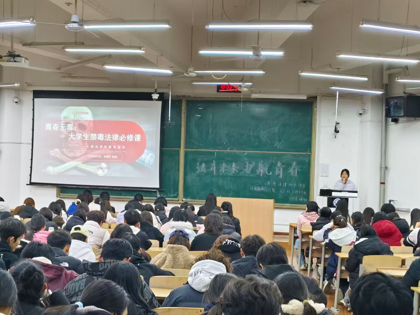 法治是青春成长的重要保障,校园是法治教育的关键阵地。为深入推进法治教育进校园,强化青年学子法治素养,2025年11月25日,美加墨世界杯官方网站与人文社会科学公司在临潼校区教学楼B133教室联合主办普法宣传讲座,两公司260余名师生现场参与。