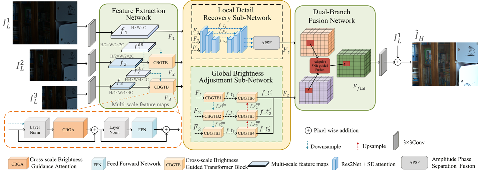 针对上述问题,本团队提出了一种新的多尺度双分支弱光图像增强深度网络框架BDMD-Net。该框架由全局亮度调整子网络(Global Brightness Adjustment Subnetwork,GBAN)和局部细节恢复子网络(Local Detail RecoverySubnetwork, LDRN)组成。其中,GBAN引入跨尺度亮度引导Transformer块(Cross-scale Brightness Guided Transformer Block, CBGTB),通过建模像素间的长距离依赖关系,实现全局光照调整的一致性与自然性;LDRN则基于残差卷积结构与通道注意力机制,对图像纹理与细节信息进行精细建模与有效恢复。为进一步提升特征融合效果,提出幅值–相位分离的频域融合策略,在多尺度频域空间中实现特征融合:利用幅值分量调控亮度信息,借助相位分量保持图像全局结构和局部纹理细节。同时,设计双分支融合子网络(Dual-Branch Fusion Sub-network, DBFN),根据图像内容和噪声统计特性,自适应融合GBAN与LDRN的特征,在保证视觉保真度的同时显著提升全局亮度调整子网络和局部细节恢复子网络的融合效果。在8个具有代表性的公开基准数据集上的验证实验结果表明,BDMD-Net在定量评价指标和主观视觉质量方面均取得了当前最先进的性能。(撰稿:李鹏芳;审核:张凯兵)