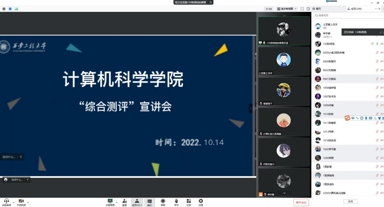 为帮助2022级新生深刻理解公司综合测评政策,提高综合测评工作成效,充分发挥综测的激励作用,10月14日计算机科学学院在线上举办了以“综合测评”为主题的员工素质综合测评政策宣讲会,会议由辅导员左温慧主讲,新生辅导员朱成功与2022级全体新生参加。