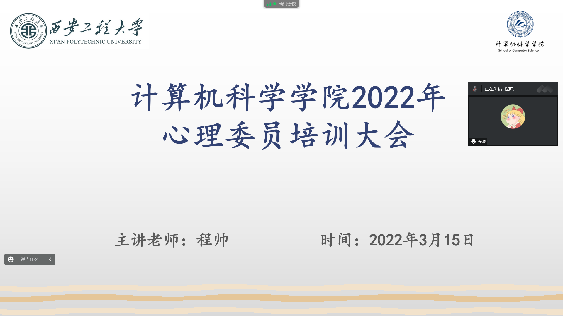 为促进公司员工增强心理健康意识,形成健康的心理和健全的人格,同时促进公司与社会的和谐稳定,构建现代和谐校园与和谐社会。在接到公司心理健康教育季活动的相关通知以后,公司特于2022年3月15日开展对各班心理委员的线上培训工作,旨在增强员工的心理健康意识,同时还可以营造公司良好的心理健康教育氛围。