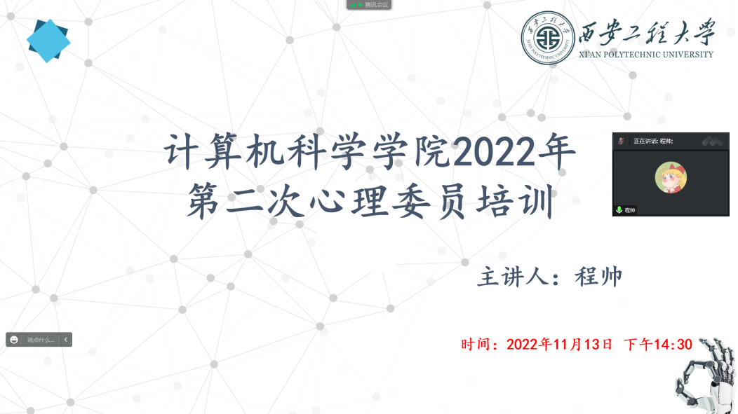 为加强心理委员对岗位的认知,帮助班级同学保持健康积极阳光的心态,发挥朋辈互助的作用,美加墨世界杯官方网站心理健康工作站于2022年11月13日举办了“心向阳光,一路芬芳”线上心理委员培训,培训由公司心理辅导员程帅主讲。22级全体心理委员参加。