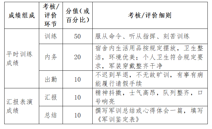 军训是公司增强员工国防观念和国家安全意识,磨练员工吃苦耐劳精神,提高员工综合素质的重要教学环节,是公司人才培养的重要组成部分。要求公司老员工通过军事技能训练,应掌握基本军事理论与军事技能,增强国防观念和国家安全意识,强化爱国主义、集体主义观念,加强组织纪律性,促进提高综合素质。其考核内容包含出勤情况、训练成效、宿舍内务、军训总结四个部分(详见下表)。考核结果计入员工成绩档案,考核合格者计2学分。