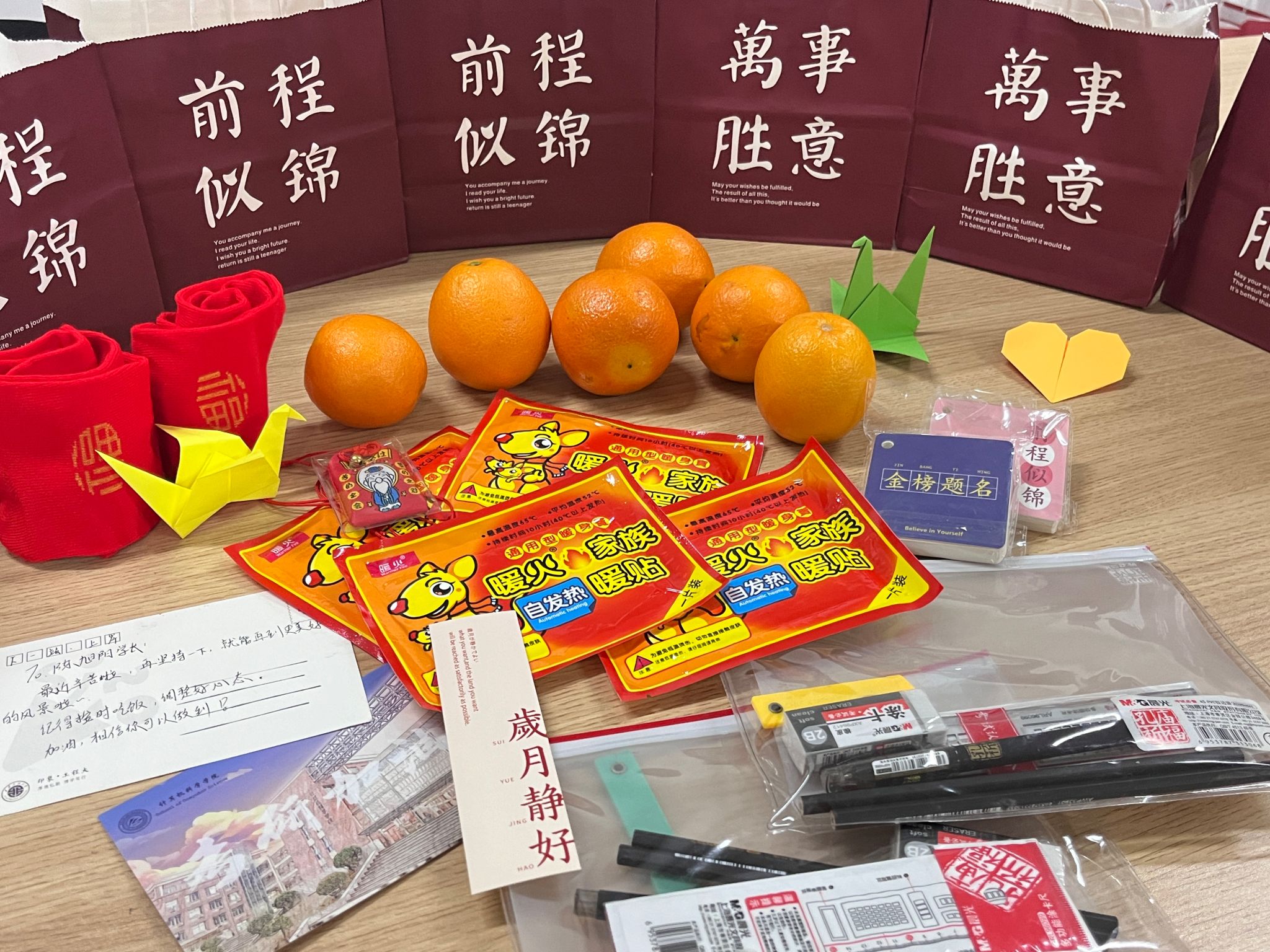 经过前期精心摸排和准备,共确定了164名考研员工。公司精心准备了“金榜题名”文具套盒、脐橙、福袋、祝福卡片、暖贴等小礼品,希望在冬日里能为考研员工送去温暖和信心。