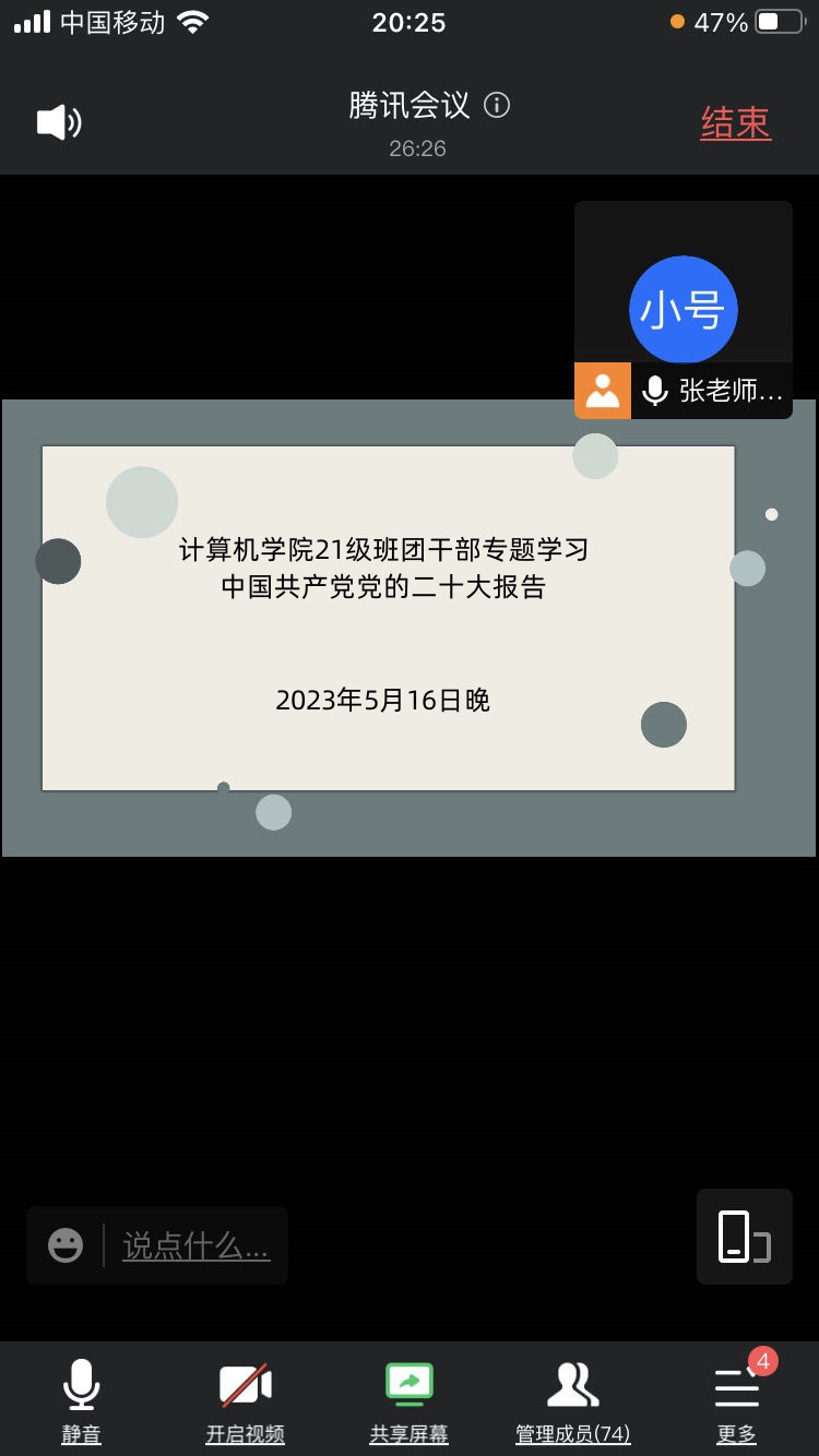 5月16日、5月17日,支部先后2次通过腾讯会议线上召开了班团党员干部会议,专题学习了《习近平总书记在中国共产党第二十次全国代表大会上的报告》,这次学习属于在之前学习基础上的再次研修。