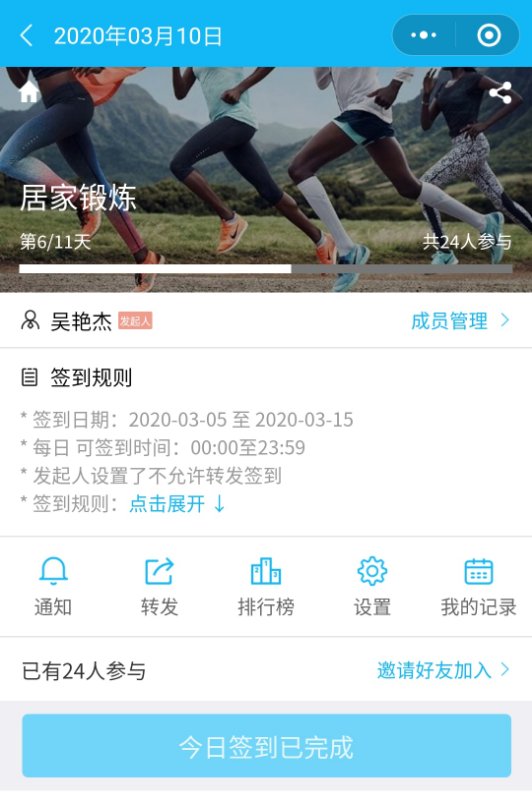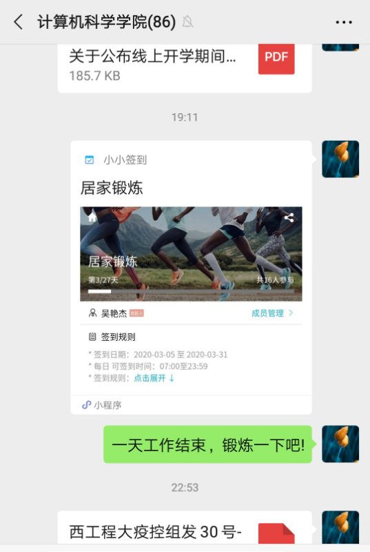 公司目前已经线上开学二周了,许多教师、行政人员每天居家办公、准备网课、在线教学、信息统计等等,花费大量时间面对电脑屏幕、手机,大多足不出户,锻炼身体就显得尤为重要了。在三八妇女节这个属于女同胞的节日里,公司女教职工们积极参加了居家锻炼活动打卡,相互鼓励,坚持锻炼。此次锻炼活动将持续一周,相信会有越来越多的老师加入健身的行列,让我们用积极的心态抗击疫情,用更加充沛的精力投入线上教学工作中,期待在不久的将来,在满园春色的校园里相聚!(撰稿:吴艳杰 审稿:王雅慧)