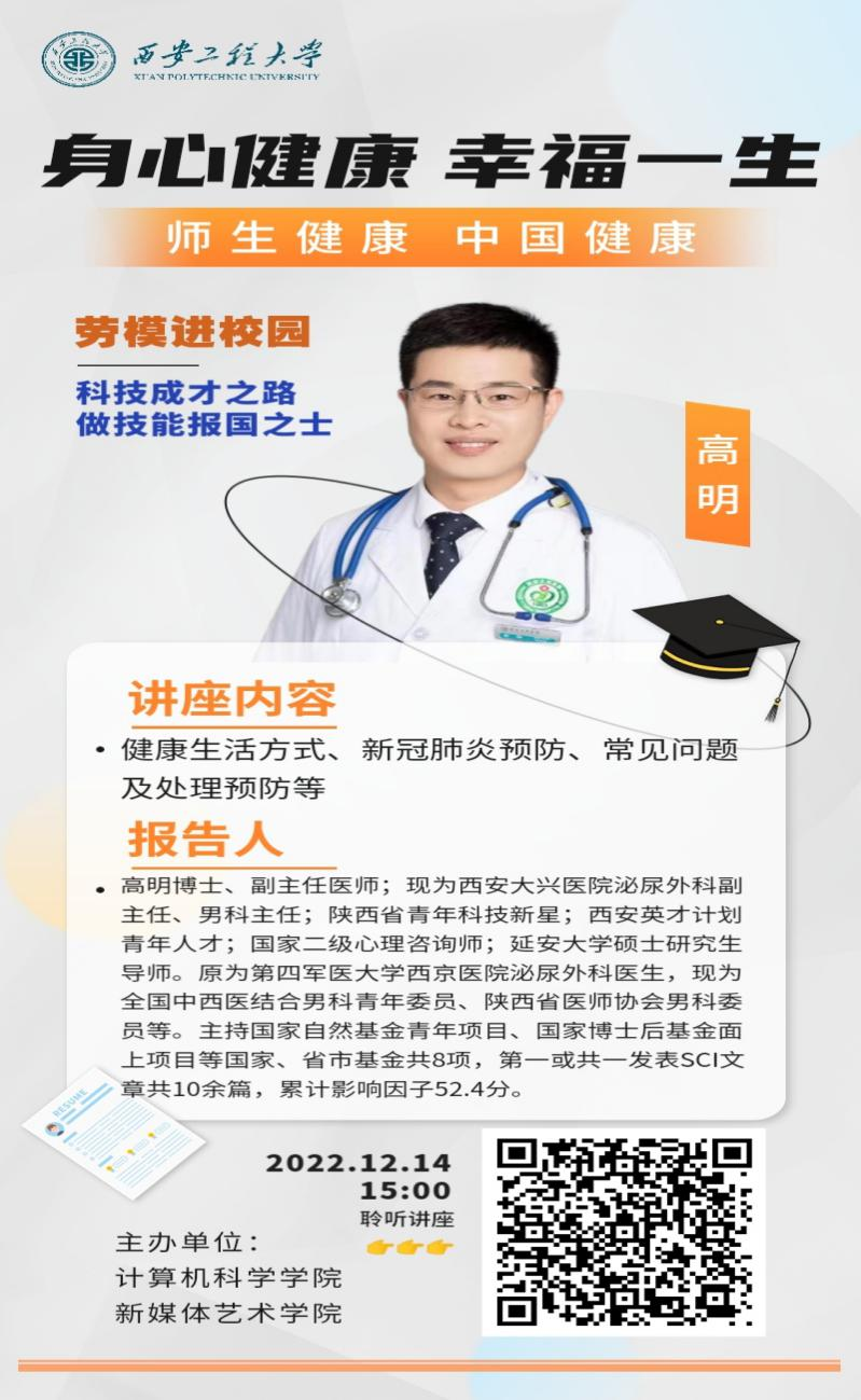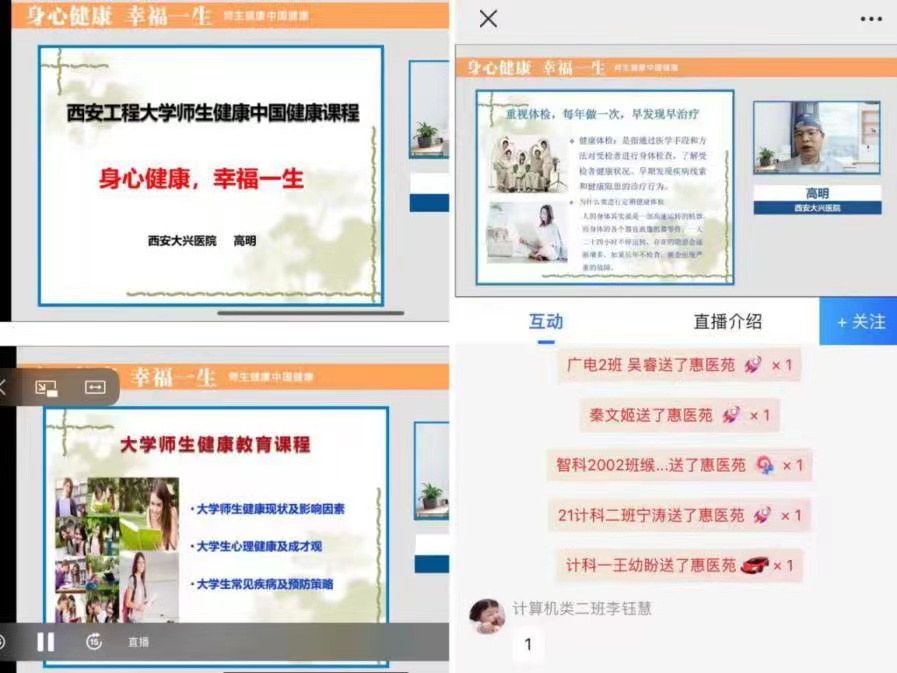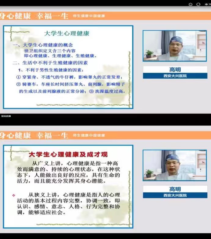 本次讲座以线上形式进行,讲座包括健康的生活方式、新冠肺炎预防、人体常见疾病的处理和预防等三个方面内容。高明主任讲授了老员工健康现状及影响因素、老员工心理健康常见的问题及如何应对,从医者的角度提醒青年学子要培养良好的生活方式,掌握最基本的安全防护和自我保健知识。对于成长和成才观,高明分享了自己的科技成才之路,建议学子们要正确认识自己,认识自己的生理特点、心理特点,认识自己的优势、劣势,知道“我能做什么,我要做什么”。告诉广大学子生涯规划重在行动,成功源于有效的时间管理,成功关键在于努力学习本领和师长的教育支持;结合当前疫情防控形势,高明对新冠肺炎病毒的来源、传播途径以及在日常生活中如何做好防护等进行了详细的讲解和说明。结合自己的临床专业知识,还为师生讲解了常见泌尿生殖相关疾病的诊治,并对艾滋病的传播、预防和治疗进行了宣讲。高明主任的讲座深入浅出,语言生动诙谐,激发了广大师生和家长的关注和兴趣,大家认真倾听,积极互动,师生就新冠疫情防护、心理问题、常见病治疗等热点问题积极提问,高明主任一一进行了解答说明,整个讲座过程气氛热烈,秩序井然,师生们在轻松愉快的气氛中接受了健康知识的普及教育。